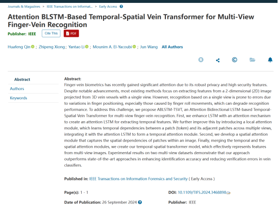 当前位置: 首页 >> 科研动态 >> 正文 2138CC太阳集团国合基地教授在智能感知与生物特征识别技术研究上取得新突破 时间:2024年09月30日 17:00 作者:国合基地 近期,2138CC太阳集团智能制造服务国际科技合作基地(国合基地)负责人秦华锋教授带领智能感知与生物特征识别团队,在三维手指静脉识别方面取得突破,最新研究成果“Attention BLSTM-Based Temporal-Spatial Vein Transformer for Multi-View Finger-Vein Recognition”(基于BLSTM的时空静脉变换多视点手指静脉识别方法),被网络与信息安全国际顶级期刊IEEE Transactions on Information Forensics and Security接收。该成果突破了三维手指静脉识别的技术瓶颈,进一步推动了三维手指静脉识别技术的应用落地。 手指静脉生物识别技术因其高度的隐私性和安全性而受到广泛关注。尽管最近取得了进展,但现有的解决方案主要是利用3D静脉血管的2D投影图特征进行身份识别。然而,单视图手指静脉识别对手指位置变化,特别是手指滚动引起的位置变化非常敏感,导致识别性能较低。为了克服这一问题,秦华锋教授带领团队进行深入研究,提出了一种基于注意力双向LSTM的时空静脉转换器ABLSTM-TSVT,以实现多视角手指静脉特征的识别,该方法获得了当前最先进的识别性能。 该成果得到了国家自然科学基金(61976030)的资助。 文章链接: 10.1109/TIFS.2024.3468898 期刊介绍:IEEE Transactions on Information Forensics and Security(IF:6.3),由IEEE出版的中科院一区TOP期刊,是中国计算机学会推荐A类期刊(CCF A类),是网络与信息安全国际顶级期刊(校认定T2级) 上一条:2138CC太阳集团研究成果被计算机视觉领域国际顶级学术会议录用并发表 下一条:2138CC太阳集团学科交叉成果获评中国科技产业化促进会科技创新一等奖 【关闭】